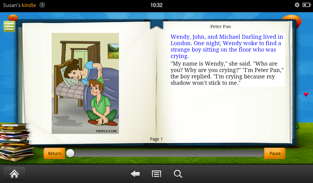 Peter Pan is a character created by Scottish novelist and playwright J. M. Barrie. A mischievous young boy who can fly and never grows up, Peter Pan spends his never-ending childhood having adventures on the island of Neverland as the leader of his gang, the Lost Boys, interacting with mermaids, Native Americans, fairies, pirates, and occasionally ordinary children from the world outside of Neverland. Tidels brings you this beautifully illustrated stories uses great story lines, and a sweet voice to inspire children and adults to learn respect, good values, ethics, morals, and good behavior.