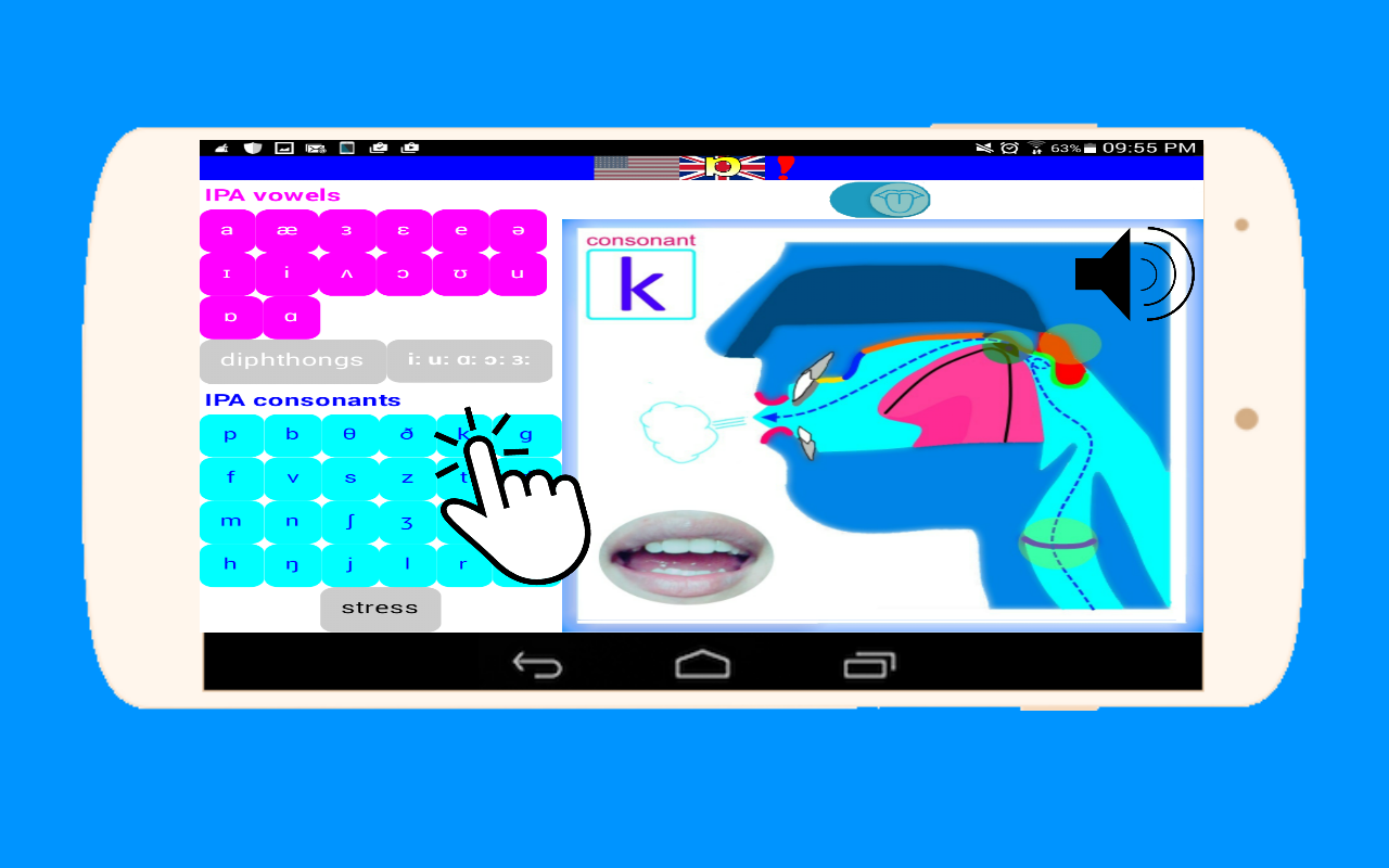 Diese App zeigt grafisch die korrekte Artikulation der Zunge mit den Lippen, Zähne, Gaumen, Zäpfchen usw. für perfekte Aussprache jeder Ton (Phonem), plus Audio eines jeden von ihnen, ermöglicht die elegante und einfache Benutzeroberfläche, die den Vergleich zwischen verschiedenen Phonemen, um den Unterschied zwischen ihnen zu sehen und verstärken ihre Lern noch mehr.