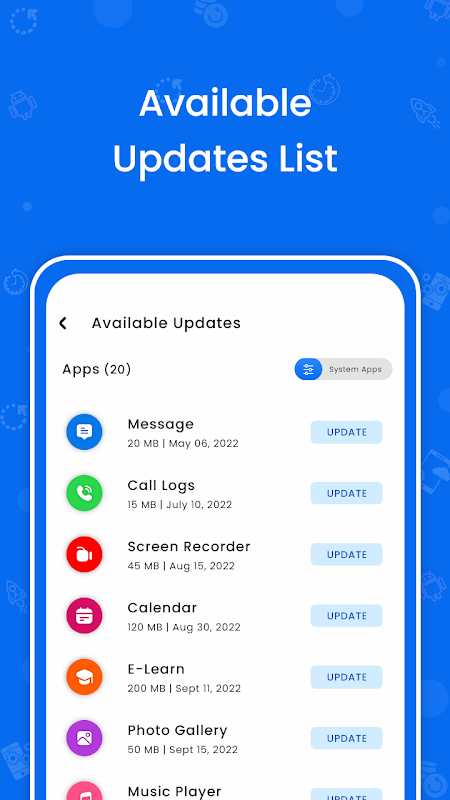 Telefon software aktualisieren – Apps aktualisieren ist ein neuer Software-Update-Checker, der automatisch nach Updates für Apps auf Ihrem Gerät sucht. Diese neueste Telefon software aktualisieren hilft Ihnen, alle Apps auf die neueste Version zu aktualisieren. Sie können alle ausstehenden Updates aller Ihrer installierten und aktualisierbaren System-Apps anzeigen.