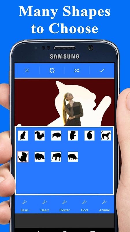This app has lots of shape overlays available which includes heart shapes, round shapes, flower shapes, creative shapes, animal shapes, love shapes and much more.