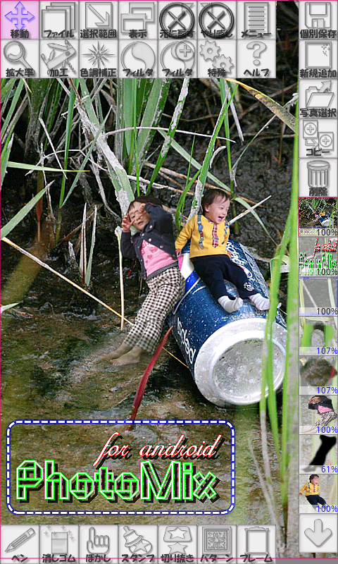 合成・プリクラ風・漫画風・モザイク・ぼかし・文字入れ等々。写真の組み合わせから編集・加工まで、そろった総合画像編集アプリ。