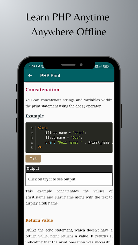 Suchen Sie nach einer umfassenden und leicht verständlichen PHP-Lernressource? Suchen Sie nicht weiter! Diese App bietet Ihnen alle wichtigen PHP-Konzepte, von den Grundlagen für Anfänger bis zur Datenbankinteraktion, direkt zur Hand. Lernen Sie jederzeit und überall offline und beherrschen Sie die PHP-Programmierung in Ihrem eigenen Tempo.