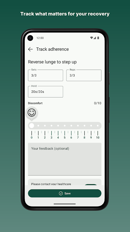 Mit PhysiApp können Sie Ihrem Physiotherapeuten oder Chiropraktiker sicher mitteilen, wie viel Sie bei einer bestimmten Übung absolviert haben und ob Sie Schmerzen verspürten.