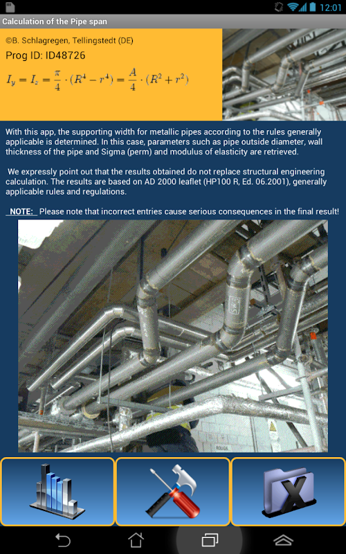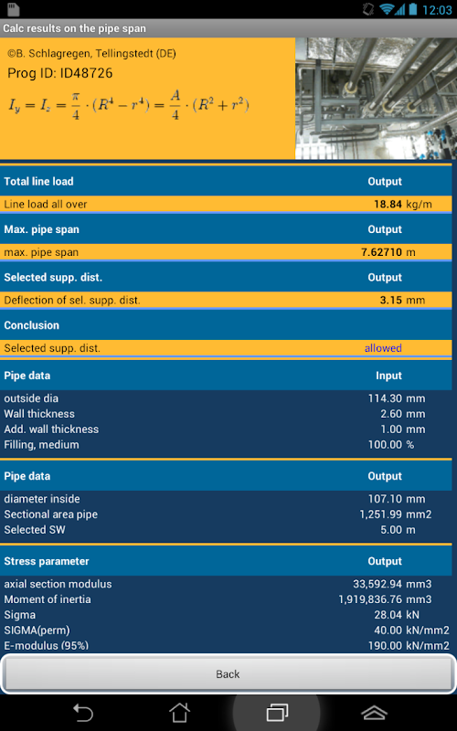 With given parameter like nominal diameter, wall thickness, Sigma(stress allowed, the E-modulus of elasticity, the additional parameters of insulation like thickness of insulation, unit weight of the insulation, the thickness of the cladding for to cover the insulation, the axial WM and never the less the Moment of inertia the deflection will be calculated automatically by the app. The stress SIGMA is calculated acc. to the real appearance of the line loads based on the input by the user.