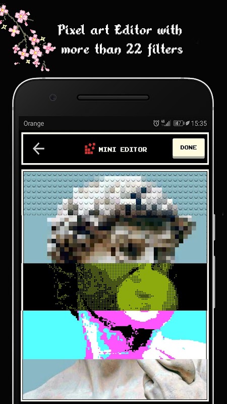 Ein Pixelart-Hintergrundbild, live und ein Pixel-Fotoeditor, alles in einer App