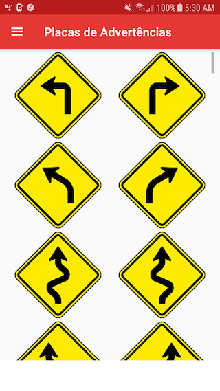 No APP você encontra as Placas de Sinalização de Regulamentação e as de Sinalização de Advertência.