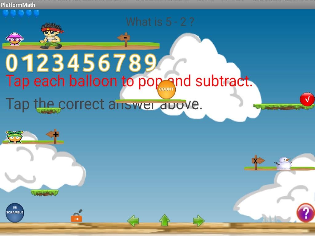 Touch the arrows to move a character to different platforms to practice addition, subtraction, multiplication, and division skills.