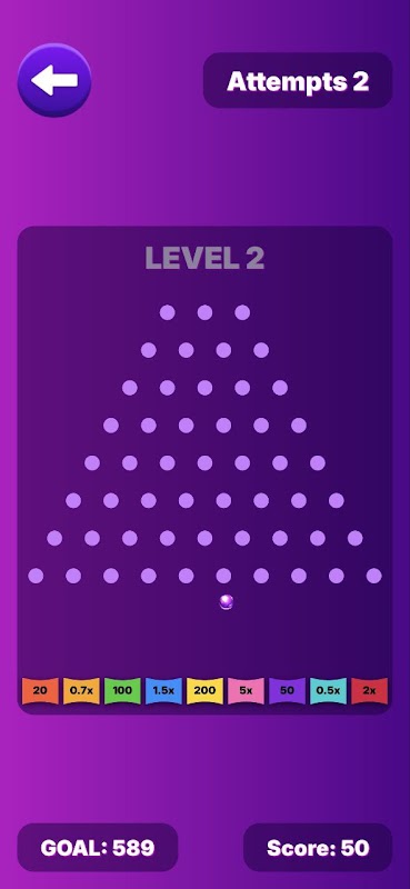 Ein Bewegungsbogen beginnt an der Spitze einer violetten Tafel, dann vollenden Rhythmus und Schwerkraft den Satz. Winzige Stöße lenken die Kugel durch ein Gitter aus sanften Lichtern, bis sie in einer farbigen Tasche darunter landet. Jeder Schlitz trägt sein eigenes Flüstern – mal ein Splitter, mal ein unerwarteter Fall – und das Ganze wird gegen ein wanderndes Ziel abgewogen. Die Würfe sind rationiert, sodass sich jeder Tropfen eher nach Instinkt als nach Kraft anfühlt. Mit fortschreitenden Levels verändern sich die Stiftmuster subtil und regen den Spieler an, Möglichkeiten zu spüren, anstatt Gewohnheiten nachzuspüren. Punktestände steigen, stagnieren oder purzeln, doch der wahre Puls verbirgt sich in der halbsekündigen Pause, bevor der Ball sein Schicksal entscheidet.