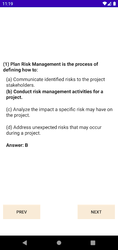 1. Umfangreiche Fragendatenbank: Greifen Sie auf eine umfangreiche Sammlung von PMP-Prüfungsfragen zu, die sorgfältig zusammengestellt wurden, um alle Wissensbereiche und Prozessgruppen abzudecken. Jede Frage ist auf die neuesten Richtlinien des Project Management Institute (PMI) abgestimmt und folgt dem Prüfungsformat, um ein authentisches Prüfungserlebnis zu gewährleisten.