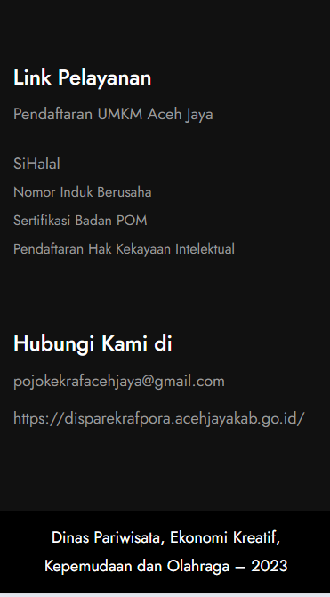 Pojok_Ekraf ist eine Innovation, die darauf abzielt, die Werbe- und Zertifizierungsdienste für Produkte der Kreativwirtschaft durch Digitalisierung zu verbessern. Diese Innovation bietet Online-Registrierungs- und Beratungsdienste für die Produktzertifizierung in der Kreativwirtschaft. Dieses Pojok_Ekraf wird später lokale Wirtschaftsprodukte im Bezirk Aceh Jaya beherbergen, einschließlich touristischer Ziele und Unterkünfte in der Region. So können die lokale Regierung, die Gemeinde, KKMU-Akteure und Tourismusmanager zusammenarbeiten und gemeinsam die Wirtschaft von Aceh Jaya entwickeln.