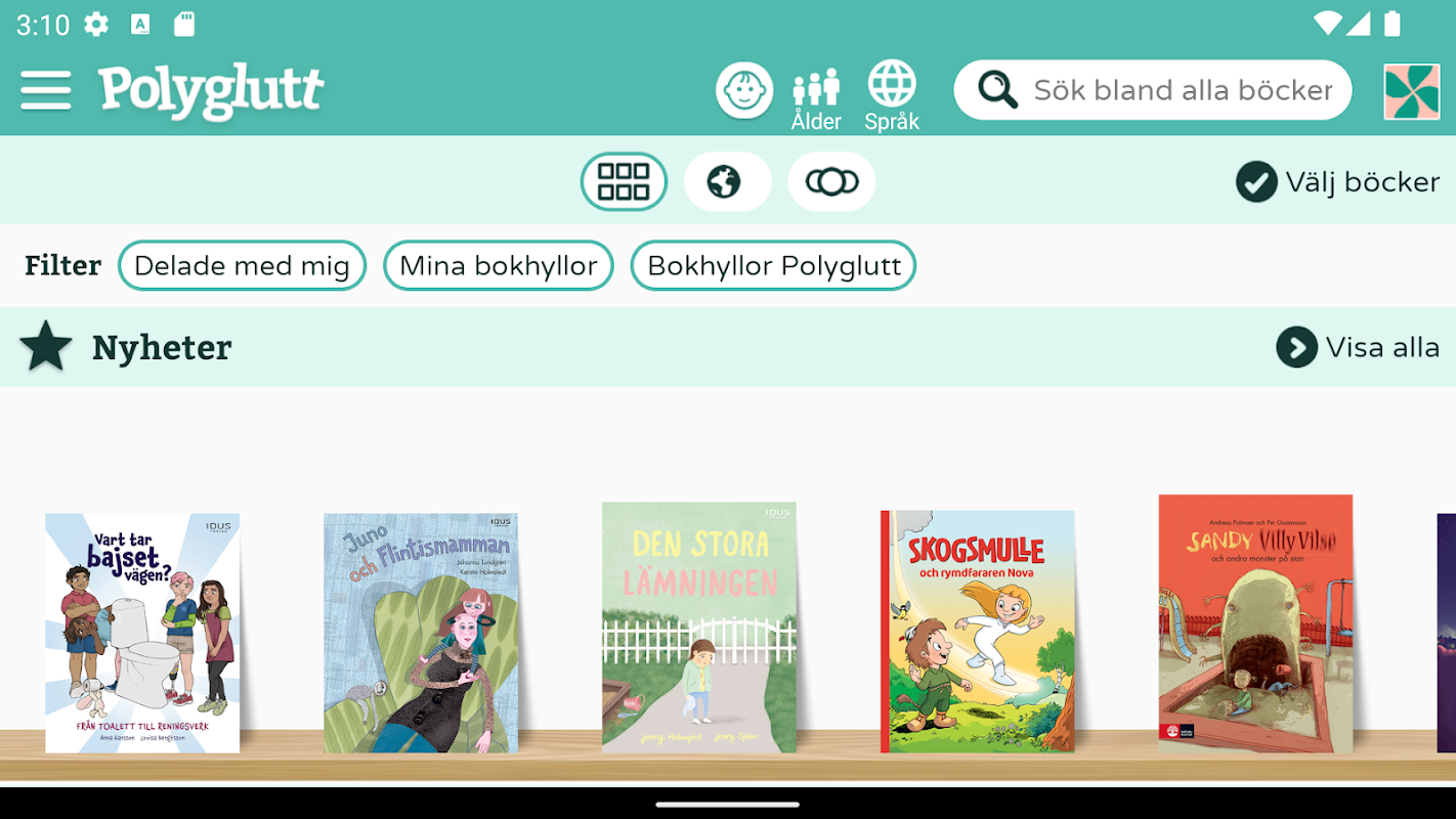 Polyglutt ist ein digitales Bücherregal, das eingelesene Bücher für den Unterricht bereitstellt. Alle Bücher werden auf Schwedisch gelesen und es gibt eine große Anzahl von Büchern mit Lauten in anderen Sprachen, z. Arabisch, Englisch, Polnisch und Somali. Es gibt auch Bücher in TAKK und schwedischer Gebärdensprache sowie visuelle Interpretation. Neue Sprachen werden kontinuierlich hinzugefügt.
