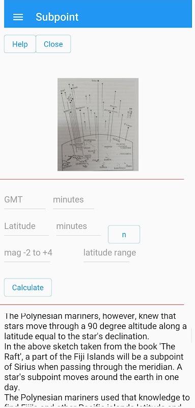Die polynesischen Seefahrer kannten ihre Hemisphäre so gut, dass sie ohne Instrumente durch sie navigierten. Diese App wird dieses Wissen ersetzen. Sie benötigen lediglich eine genaue Uhr, z.B. Ihr Telefon oder eine Uhr (auf GMT eingestellt)