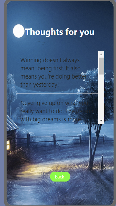 Die App hilft Menschen, indem sie ihnen morgens oder abends positive Gedanken mitteilt. Es gibt positive Worte aus, während man damit Musik spielt.