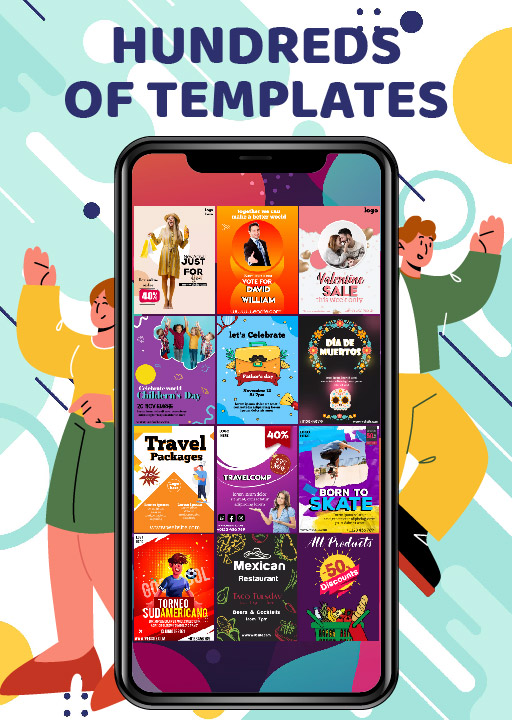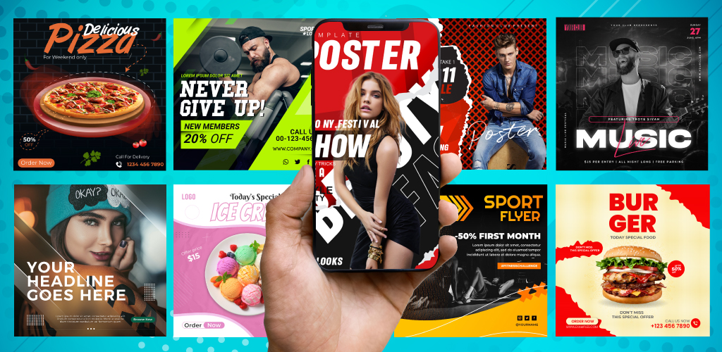 Diese App enthält anpassbare Designs, sodass Sie ganz einfach Ihre eigenen Poster und Werbetafeln aus vorgefertigten Vorlagen erstellen können, die Ihnen helfen, ein korrektes Layout aller Komponenten zu finden.