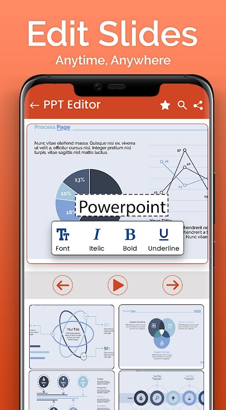 PPT-Reader und PPT-Viewer erleichtern Benutzern das Lesen, Anzeigen und Bearbeiten von PowerPoint-Präsentationen mit nur einem Klick. Die Präsentation ermöglicht es dem Benutzer, seine gesamte Präsentation anzuzeigen und sie allen anderen als Diashow zu zeigen. Benutzer können ihre Büroaufgaben, Schule, Hochschularbeiten, Universitätsaufgaben und Geschäftspräsentationen einfach mit dem PPT-Dateiöffner öffnen. Der Benutzer kann Folien erstellen und diese sehr einfach über eine Diashow anderen zeigen. Mit PPT-Dateiöffner und PowerPoint: PPT-Dateileser und Dateibetrachter ist eine vollständige Office-App, mit der Benutzer Dokumente einfach auf ihrem Smartphone lesen, anzeigen und bearbeiten können. Öffnen Sie ganz einfach alle Ihre Notizen zu Büroaufgaben, Geschäftsaufgaben, Schulvorlesungen und Tutorials auf Ihrem Gerät.