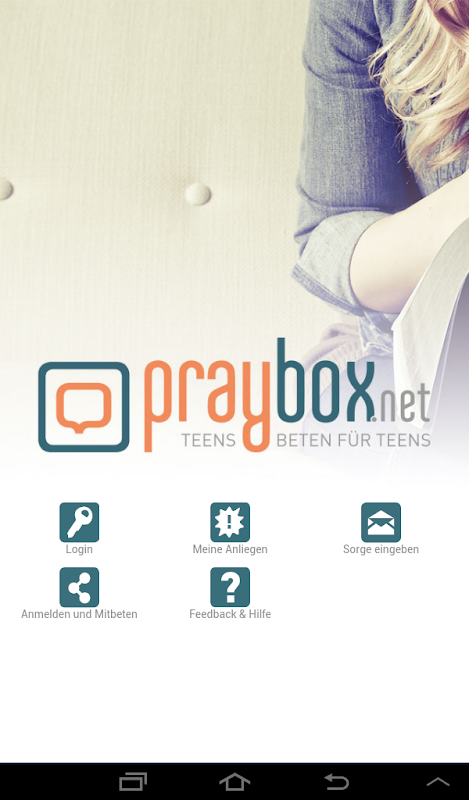 Erwachsenenfreie Zone: Praybox ist nur für Teenager! Und Praybox ist völlig anonym - nicht einmal eine Anmeldung ist erforderlich (aber möglich, wenn du magst). Trotzdem siehst du über die App, wieviele Leute für dein Anliegen beten. Sie können dir sogar kurze persönliche Ermutigungen zukommen lassen und du kannst ihnen mitteilen, wenn sich etwas bezüglich deines Anliegens getan hat! Also anonym und doch persönlich…
