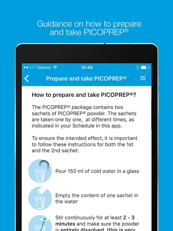 - Die App gibt Ihnen auch Empfehlungen dafür, was Sie bei jedem Schritt des Ablaufs essen und trinken sollen (und was nicht) und wie Sie das PICOPREP® Präparat vorbereiten und einnehmen sollen.
