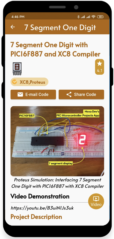 Wenn Sie Elektronik-/Computer-/Ingenieursstudent oder Bastler im Bereich eingebettete Systeme und Firmware-Design sind, sollten Sie diese App verwenden. Diese mobile App, "PRO PIC Microcontroller Projects", bringt beeindruckende Projekte und Beispielcodes für Sie. Anstatt Bibliotheken zu verwenden, die von anderen Ingenieuren und Entwicklern entwickelt wurden, basieren alle Projekte in dieser App auf den Registern, die nur im Datenblatt des PIC16F887 zu finden sind. Darüber hinaus erhalten Sie in dieser mobilen App auch Proteus-Simulationsdateien für jedes einzelne Projekt.