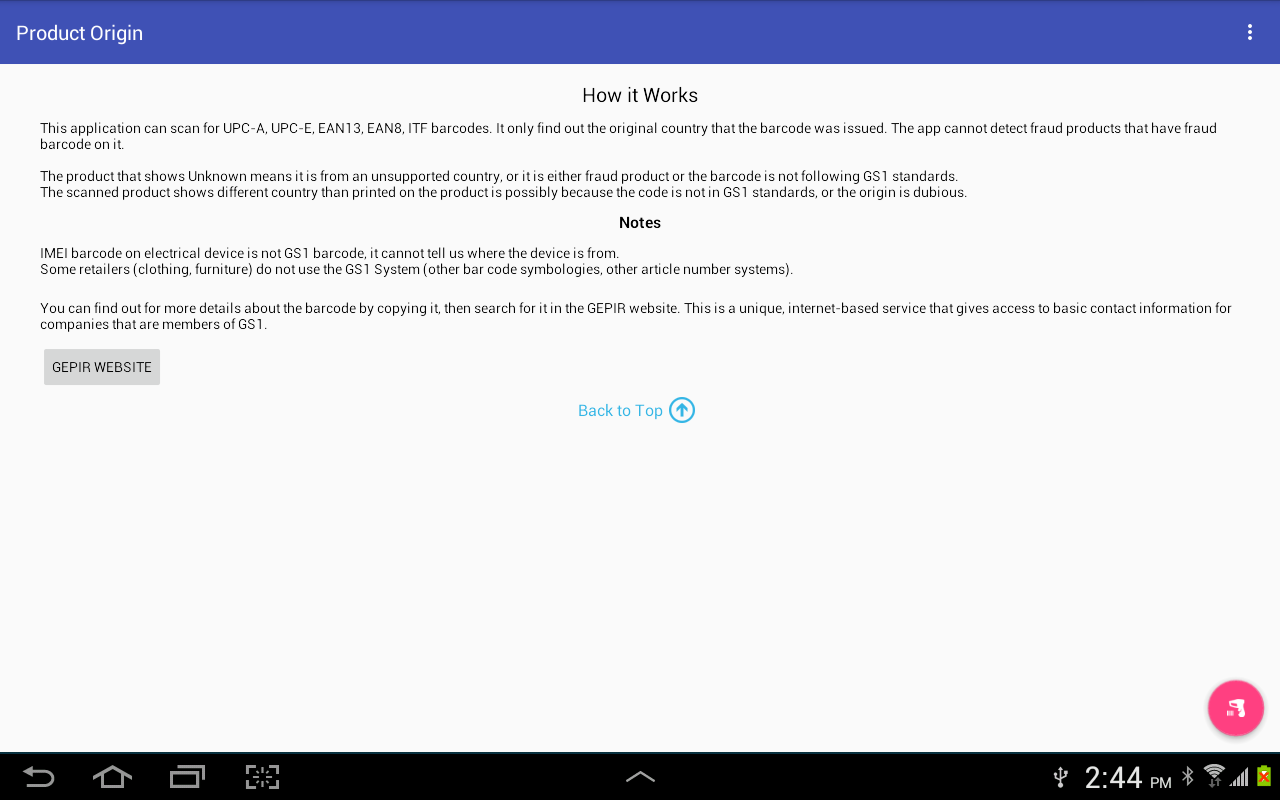Scannen Sie den Barcode des Produktes über der Kamera des Telefons und dann diese App wird Ihnen sagen, wo es aus auf der Basis der GS1-Standards ist.