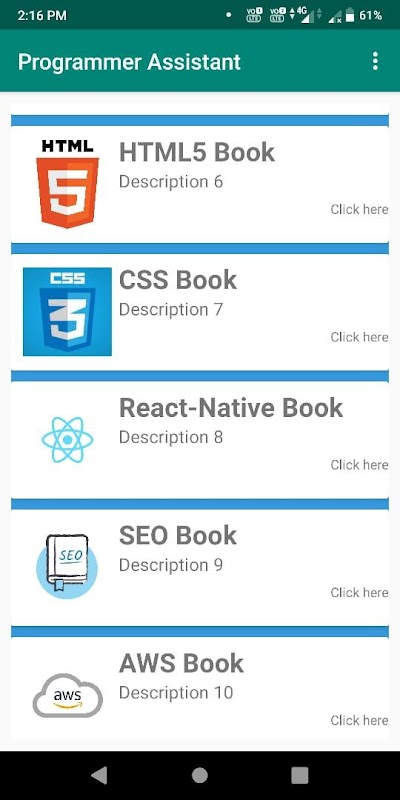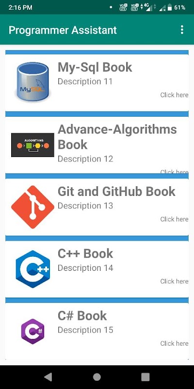 Dies ist eine Lernanwendung zum Programmieren. In dieser Anwendung kann jeder die Programmiersprache durch Lesen dieser Bücher erlernen. Sie ist ein guter Helfer oder Assistent für professionelle Programmierer.