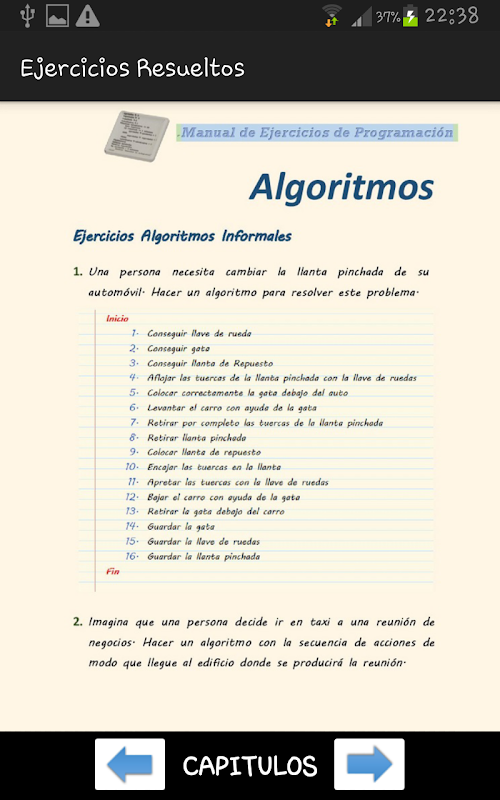 * Al finalizar cada capitulo podrás poner en practica tu conocimiento mediante un TEST DE PREGUNTAS que sera calificado... finalmente podrás revisar el repositorio de Ejercicios Resueltos sobre Algoritmos, Pseudocodigos y Diagramas de Flujo todo esto en una sola aplicación!!.