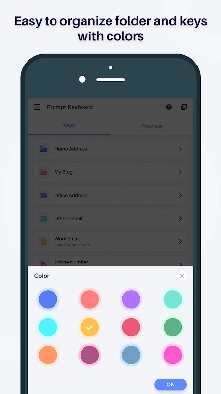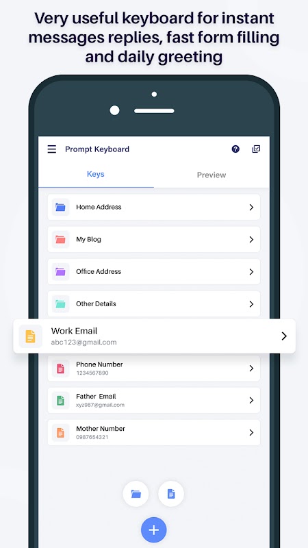 Prompt Keyboard - Instant Keyboard Phrases App sehr nützlich, um Ihre Telefonnummern, E-Mail-Adressen, Support-Antworten, schnelles Ausfüllen von Formularen, Adressen, Telefonnummern, Ihre Lieblings-Emojis oder alles, was Sie regelmäßig eingeben, zu speichern.