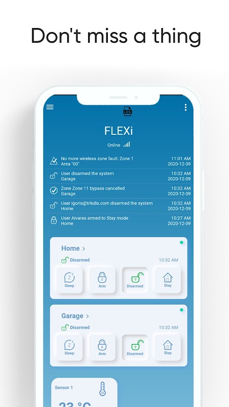 Erhalten Sie den Alarmstatus in Echtzeit und aktivieren oder deaktivieren Sie Ihr Sicherheitssystem aus der Ferne. Erhalten Sie bei einem Sicherheitsalarm sofortige Benachrichtigungen oder lassen Sie sich einfach benachrichtigen, wenn Ihre Familie nach Hause kommt.