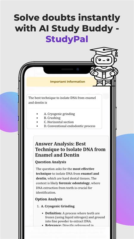 Umfassende Fragendatenbank: Mit über 32.000 MDS NEET PG-MCQs mit erklärten Lösungen in der PULP NEET MDS-Vorbereitungs-App können Sie Ihre Handbücher beiseitelegen. StudyPal: Unser interner KI-Chat beantwortet Ihre Fragen in Sekundenschnelle mit referenzbasierten Antworten.