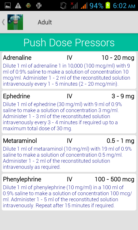 Diese Anwendung bietet dem medizinischen Fachpersonal mit einem Verfahren der Titration Inotropika und Vasopressoren in einer kontrollierten Art und Weise ohne Notwendigkeit für eine Infusion. 'Push Dose Kompressoren "können schwerkranke Erwachsene und Kinder schneller Zugang zu lebensrettenden vasoaktive Medikamente zu erhalten. Entwickelt, um Stabilität zu gewährleisten, während ein Standard-Infusions vorbereitet oder wenn man erwartet, hämodynamische Kompromiss zu kurzlebig sein, z. B. Einleitung der Narkose. In einer Angelegenheit von Sekunden diese Anwendung bietet Dosen und Verwaltungsanweisungen für folgende: