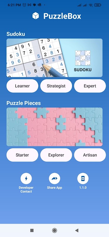 Entfesseln Sie Ihren inneren Rätselmeister mit PuzzleBox, der ultimativen App für kniffligen Spaß, mentale Herausforderungen und stundenlange Unterhaltung! PuzzleBox bietet Ihnen spannende Rätsel, die Ihren Verstand schärfen und Ihnen endlosen Spielspaß bieten. Egal, ob Sie Gelegenheitsspieler oder erfahrener Rätselfan sind, in der vielfältigen Sammlung finden Sie etwas, das Ihnen gefällt. Entdecken Sie Klassiker wie Sudoku, Kreuzworträtsel und Puzzles oder fordern Sie Ihre Logik mit kniffligen Labyrinthen und spannenden Worträtseln heraus. Mit unterschiedlichen Schwierigkeitsgraden bietet PuzzleBox für jeden Spieler das Richtige – von schnellen Denkübungen bis hin zu fesselnden Spielrunden. Die benutzerfreundliche Oberfläche und das ansprechende Design machen das Rätsellösen zu einem vergnüglichen Erlebnis. Ob unterwegs oder entspannt zu Hause – PuzzleBox ist Ihr idealer Begleiter, um Ihr Gehirn zu stimulieren und Spaß zu haben.