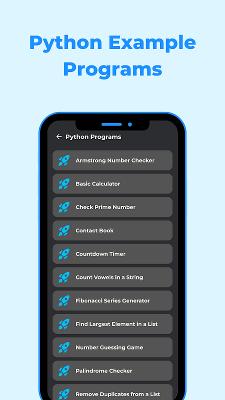 Erleben Sie die Leistungsfähigkeit der Python-Programmierung auf Ihrem Mobilgerät mit der Python-IDE. Diese Hochgeschwindigkeits-App liefert genaue Ergebnisse mit außergewöhnlicher Effizienz. Die elegante und intuitive Benutzeroberfläche sorgt für ein nahtloses Codierungserlebnis, Tag und Nacht.