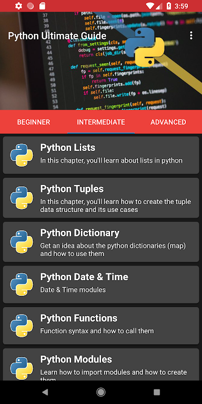 Python Ultimate Guide is an app to help you learn python programming language, it is intended for advanced programmers and also beginners ! the app includes a set of lessons divided in three sections :