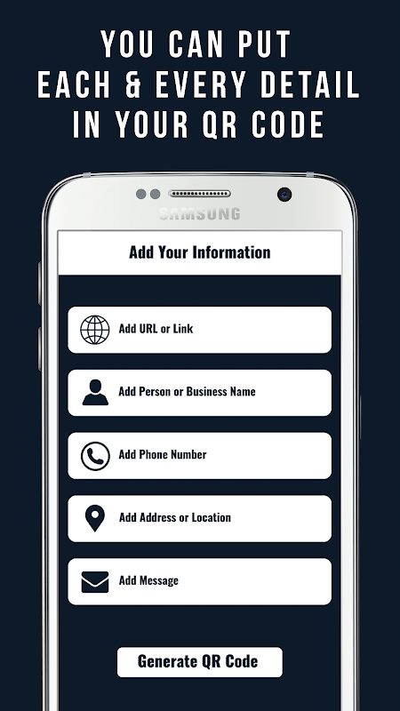 You can save all your information in single QR Code like Name, Contact, Message, Email address, Mailing Address, Website and Company Details.