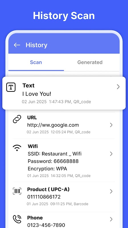 Intelligenter Scanverlauf: Überprüfen Sie alle gescannten und generierten Codes in einem übersichtlichen Verlauf und greifen Sie schnell auf frühere Informationen zu.