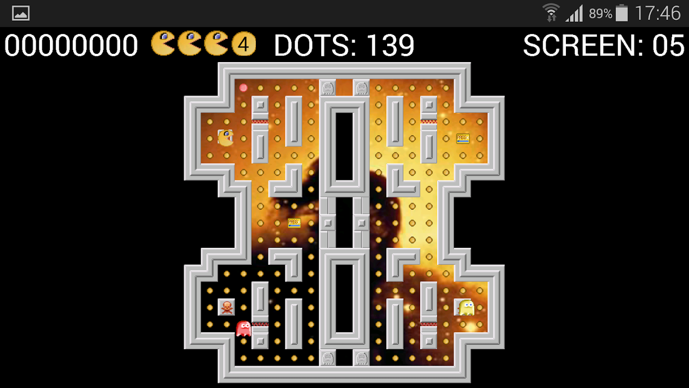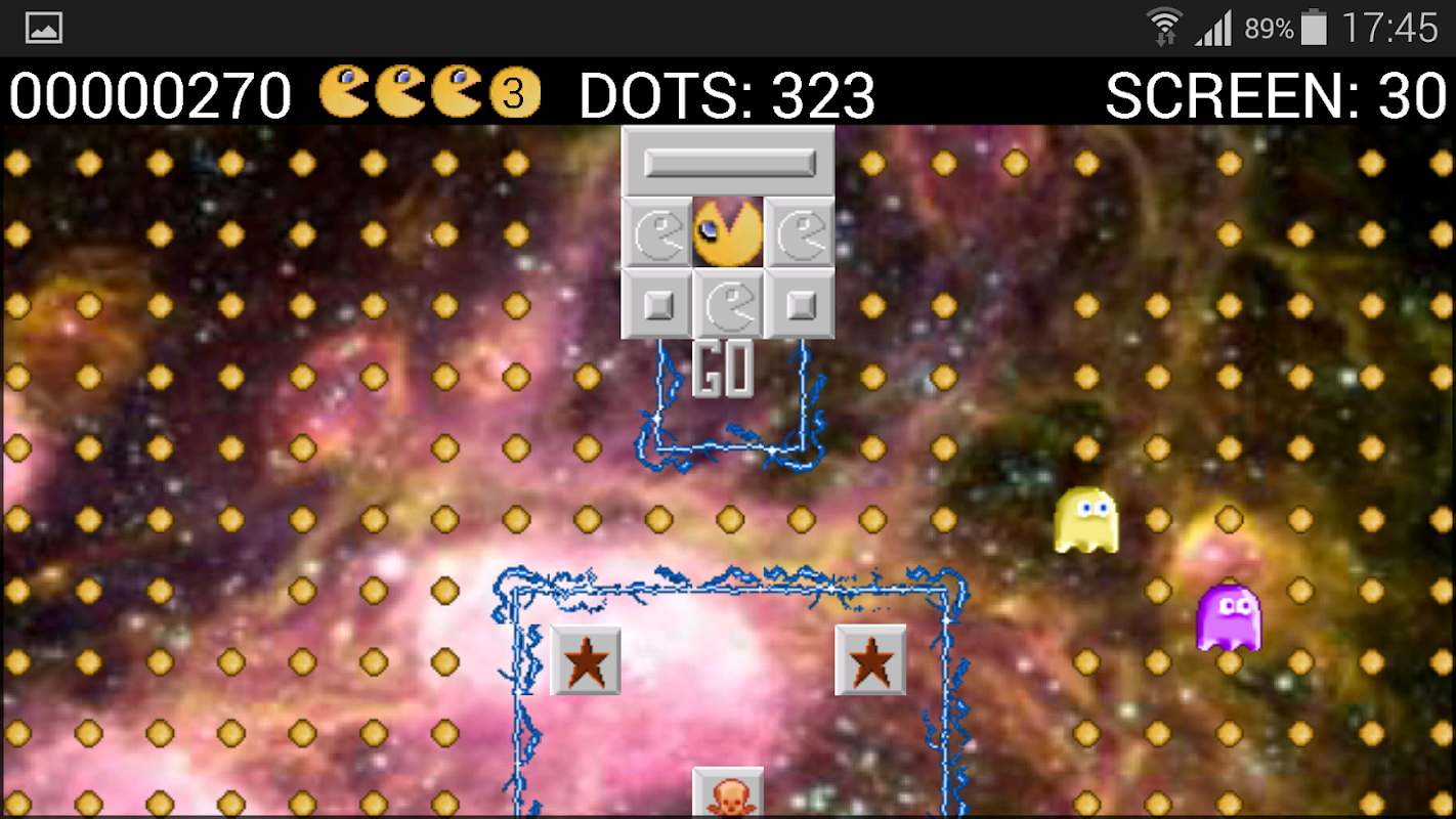 * To overcome the screens, the QUELMAN must eat all the dots and avoid being caught by the ghosts and dodging danger zones.