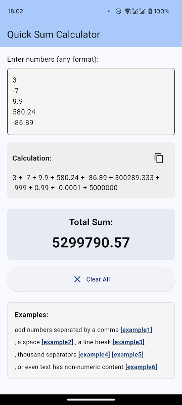 Intelligenter Rechner für schnelle Summen mit flexiblen Eingabeformaten und Fehlerkorrektur.