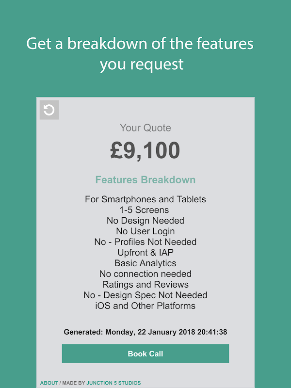 Quoter from Junction 5 Studios breaks down the technical details of your app in easy to understand sections. This way you can figure out what features you need for your app so we can give you a quote for how much it would cost for us to make it.