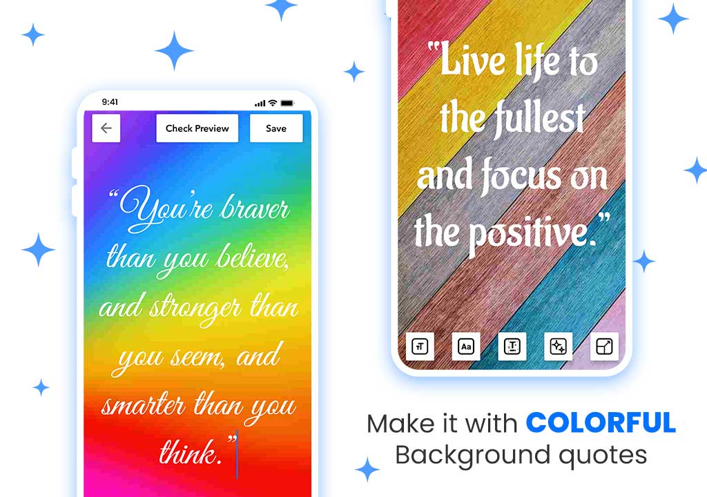💃 Add text on the image of your choice and set it as wallpaper. Customize background with your choice of Text, Texture & Background image. You can create Art wallpaper, Gradient wallpaper, Solid color wallpaper, Texture wallpaper, Pattern wallpaper, Customized wallpaper, Custom wallpapers, Classy wallpaper & easy Text wallpaper with Quote Maker smart App.
