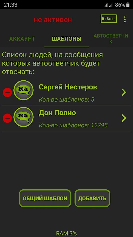 • Импорт и экспорт баз шаблонов в формате .bin, совместимом с другими чат-ботами, а также в формате .rbt, хранящем в себе настройки шаблонов, сделанном в приложении;