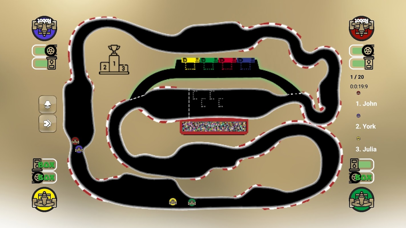Aber Achtung: Bei schneller Fahrt, verbraucht dein Wagen viel mehr Kraftsstoff und die Reifen werden besonders stark abgenutzt. Wenn man sich zu spät für die Box entscheidet, kann man auch ganz ausfallen. Es gewinnt, wer als erster die Ziellinie überfährt.