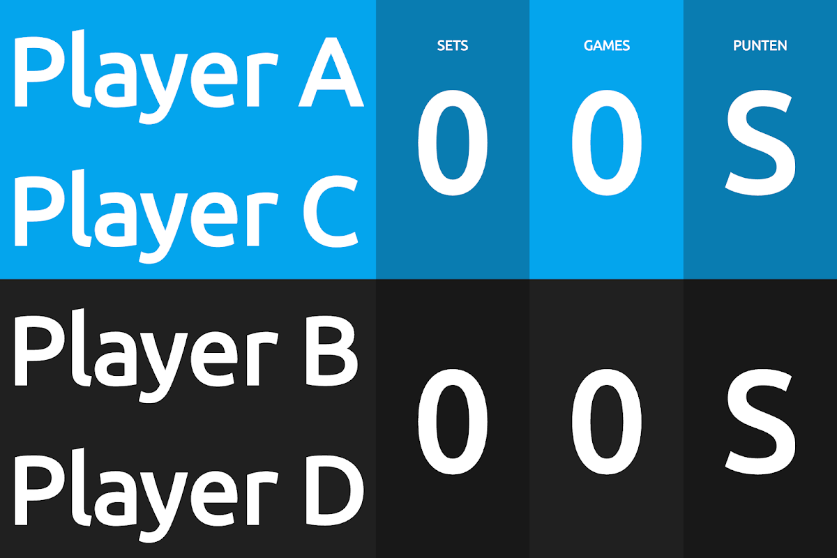Verfolgen Sie Sätze, Spiele und Punkte auf einer übersichtlichen Anzeigetafel. Unterstützt Einzel und Doppel, benutzerdefinierte Spielregeln, Golden Point und Super-Tiebreak.