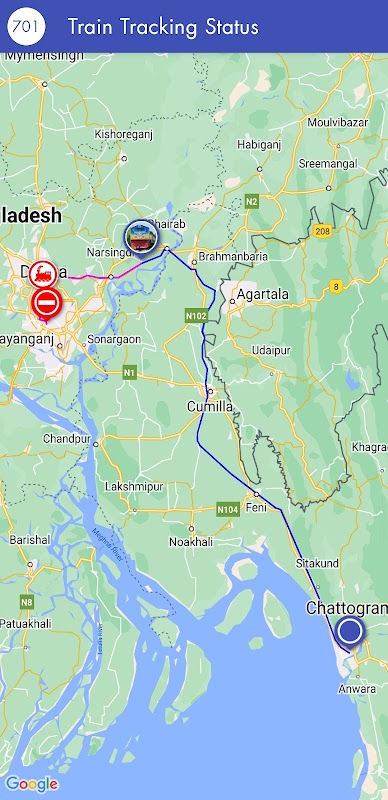 Aktueller Standort, Route und Fahrplan der Intercity-Züge der Bangladesh Railway.