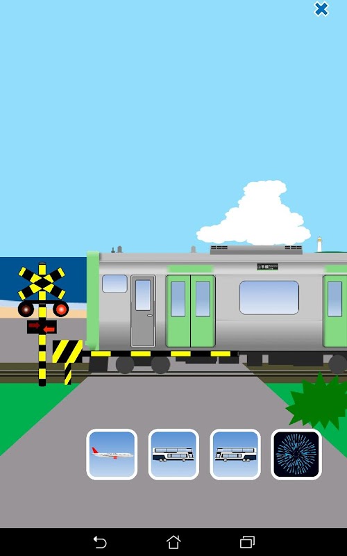 Die fünf auf dem Bildschirm angezeigten Schaltflächen (Kreuzung, Flugzeug, rechts abfahrender Bus, links abfahrender Bus und Feuerwerk) lösen die jeweiligen Aktionen aus.