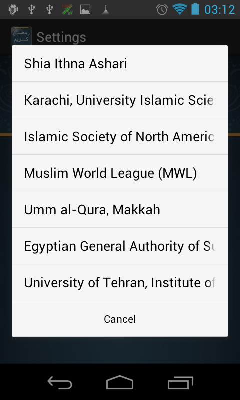 The calculation methods used to work out the Fajr and Maghrib timing supported by this app include: