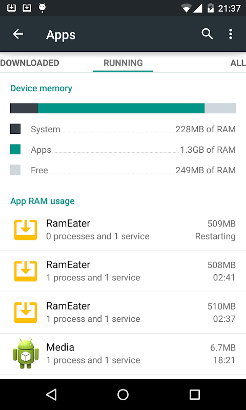 Android beschränkt die Speicher einem Prozess verwendet werden können. RamEater kann eine Reihe von Dienstleistungen jeden in einem eigenen Prozess, um genügend Speicher, um den gesamten Speicher im Telefon erschöpfen zuzuweisen starten. Da der Speicher in einem Service zugeordnet Android wird töten andere Vordergrundaufgaben, bevor es tötet RamEater Dienstleistungen.