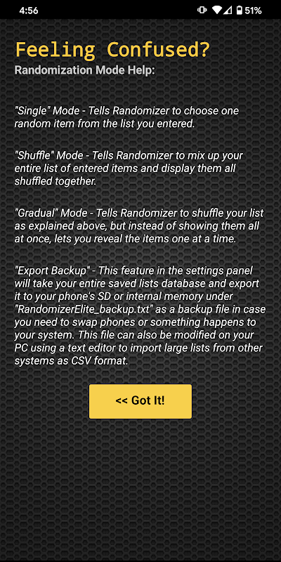 Mit Randomizer Elite können Sie Ihre eigenen Listen und eingegebenen Elemente schnell mischen, zufällig sortieren oder eine Entscheidung treffen. Mit Elite können Sie jetzt neue Randomisierungsmodi und -funktionen hinzufügen und Listen sichern, exportieren und sogar importieren!
