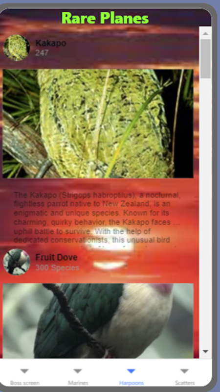 Wenn Sie auf Marines klicken, wird ein Bildschirm mit Unterwassertieren angezeigt. Wenn Sie auf die Harpunen klicken, gelangen Sie zu den fliegenden Tieren und auf die Schaltfläche „Scatter“ gelangen Sie zu den Landtieren. Diese App zeigt den Tierbestand von 2023.