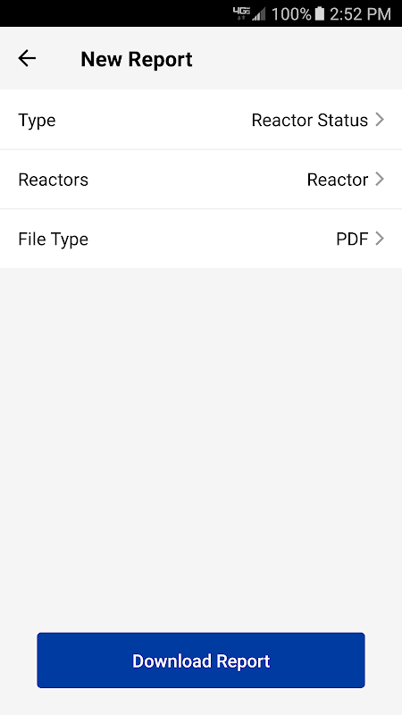 Überwachen Sie mehrere Reaktor Systeme über das Dashboard der App, das Ihnen Übersichtsdaten zu jeder Maschine gibt. Mit der Berichtsfunktion der App können Sie verfügbare Berichte erstellen, anzeigen und senden.