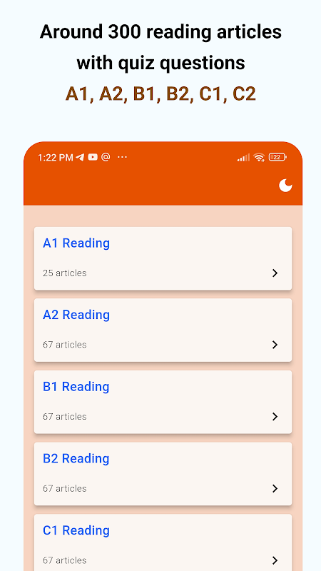 Bereiten Sie sich auf Englischprüfungen wie IELTS, TOEFL oder CEFR vor? Diese App ist das ultimative Tool zur Verbesserung Ihres Leseverständnisses und zur Erweiterung Ihres themenspezifischen Wortschatzes. Es wurde für Lernende auf den Niveaustufen A1 bis C2 entwickelt und eignet sich perfekt für Schüler in jeder Phase ihrer Sprachreise.