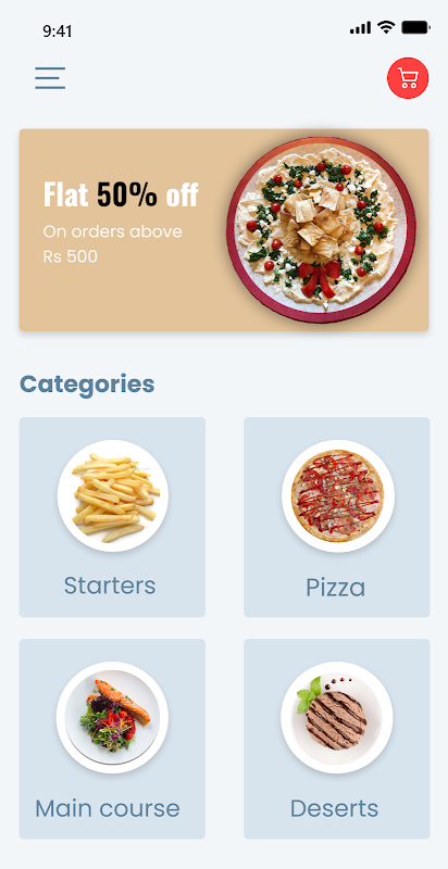 Kategorienbasiert: Hier kann Ihr Benutzer die Produkte finden, die auf Ihren Kategorien basieren. Der Administrator kann seine kategorienbasierten Produkte hochladen, sodass Benutzer ihr Lebensmittelprodukt anhand ihres Interesses leicht finden und Zeit sparen können, während sie über unsere App eine Bestellung aufgeben.